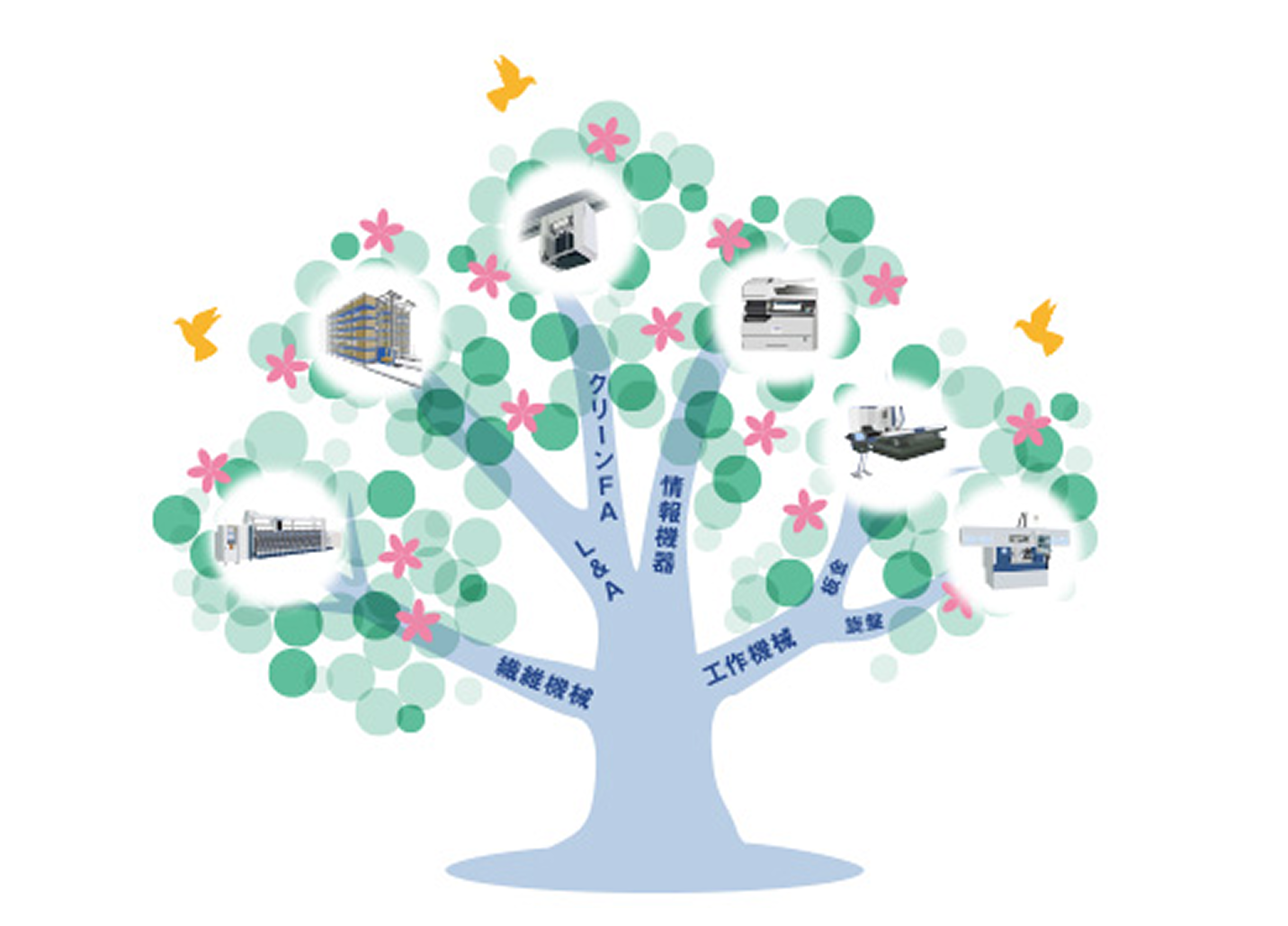 繊維機械事業で創業した村田機械は、90年の歴史の中で事業軸を5つに広げてきました。各事業が目指す市場は全く異なり、関わりがないように見えますが、同じ根本から生まれ、それぞれに活動・事業の領域を広げています。