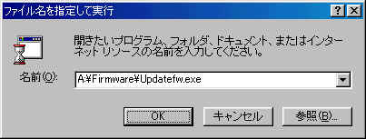 (2) Windows 上のエクスプローラ、ファイルマネージャ、「ファイル名を指定 して実行」などで、フロッピディスクドライブの"Firmware"フォルダーの下の"UPDATEFW.EXE" を実行します。