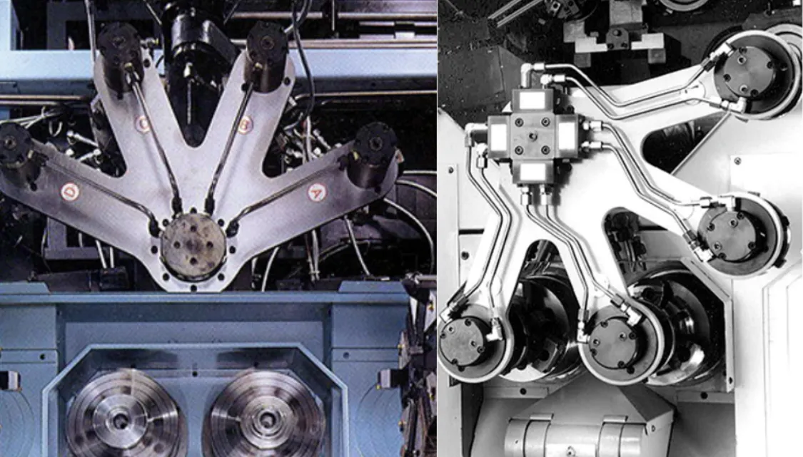 旋回式ローダ以外では、アームが前後左右の2軸で動くローダもありましたが、加工ロットごとに調整が必要である点は変わりませんでした。打開策を探る中で、アイデアマンとして知られていた当時の部長が、自宅の座敷で寝転びながら天井の升目を眺めていたときに、